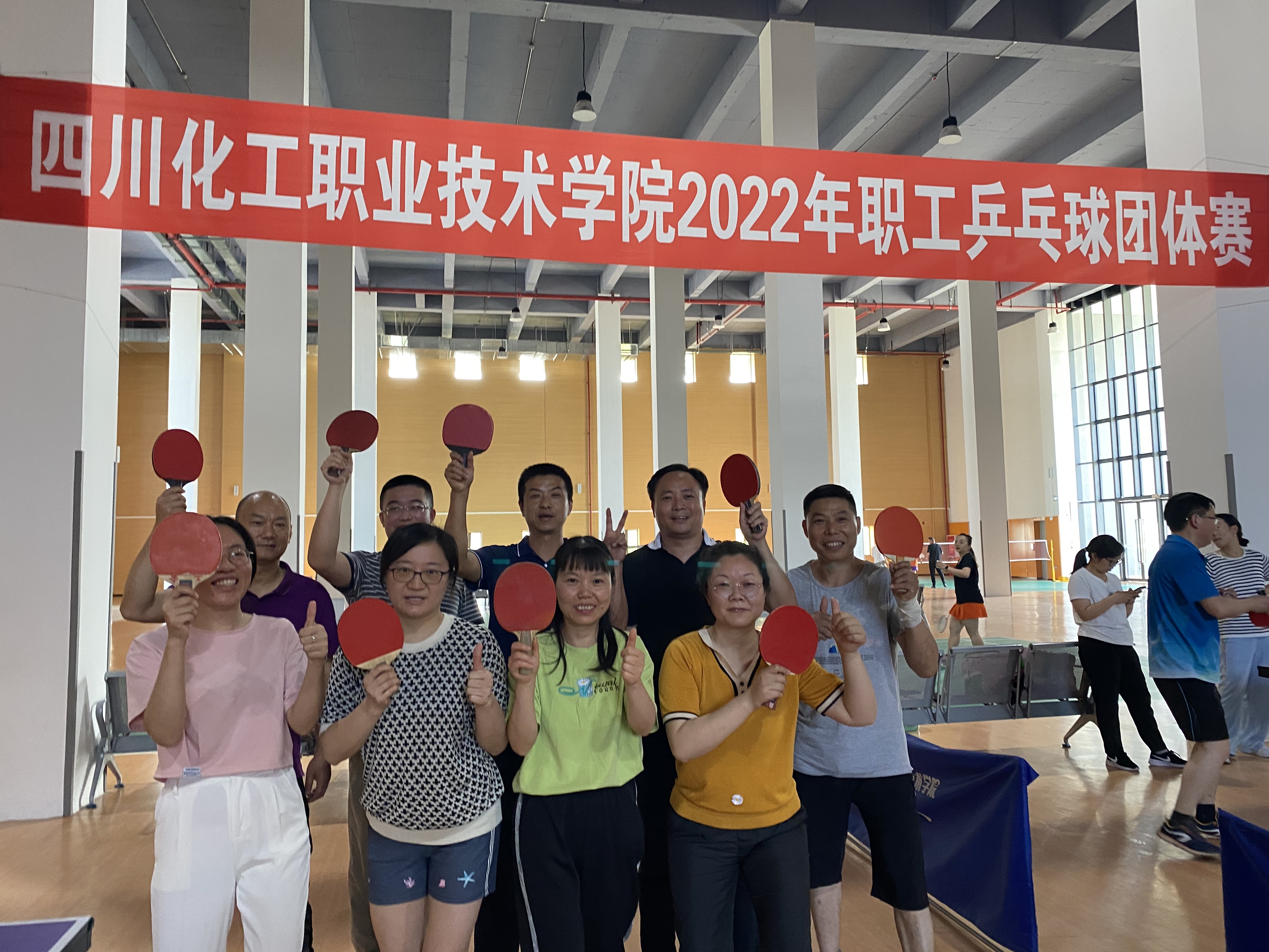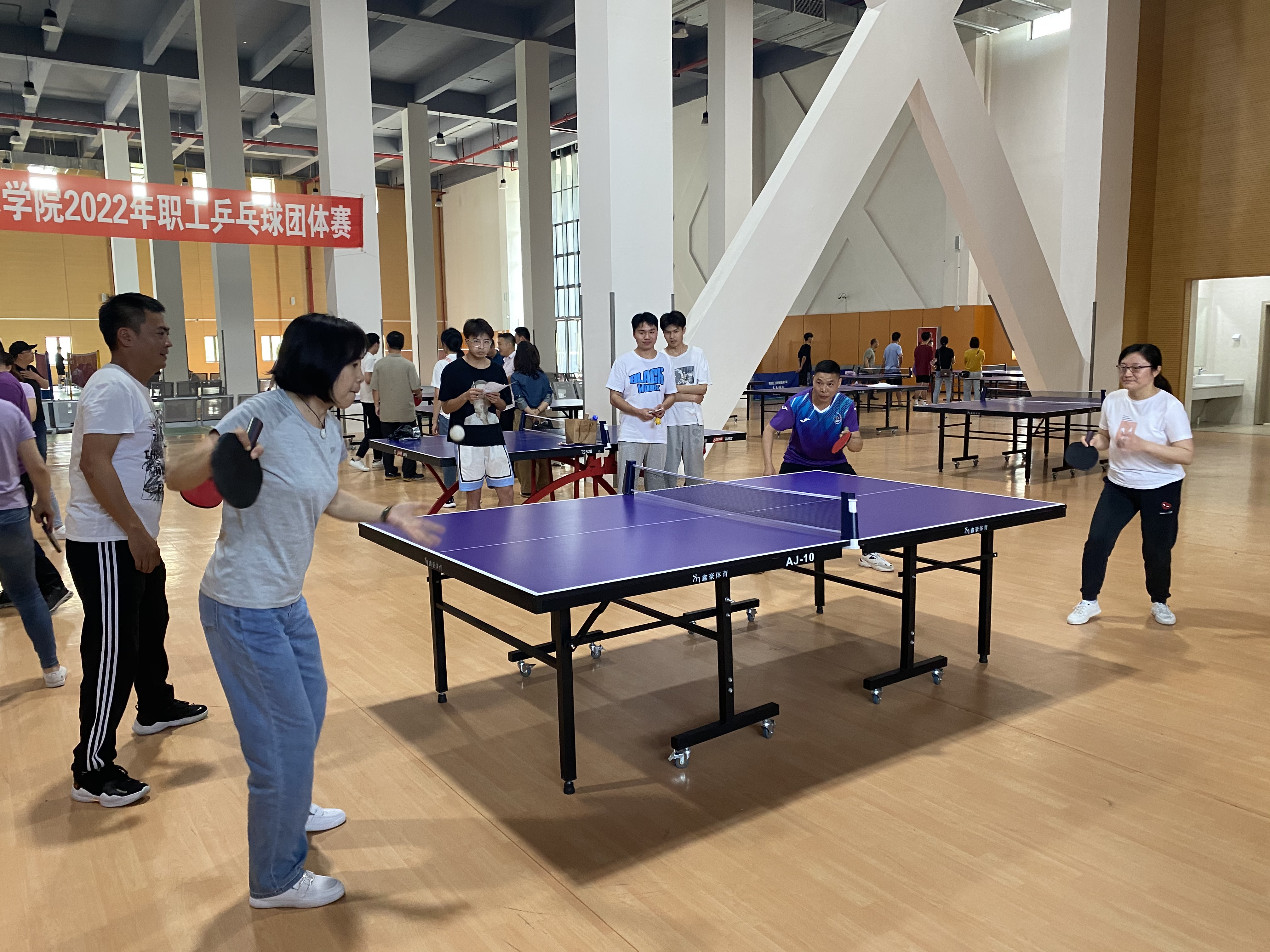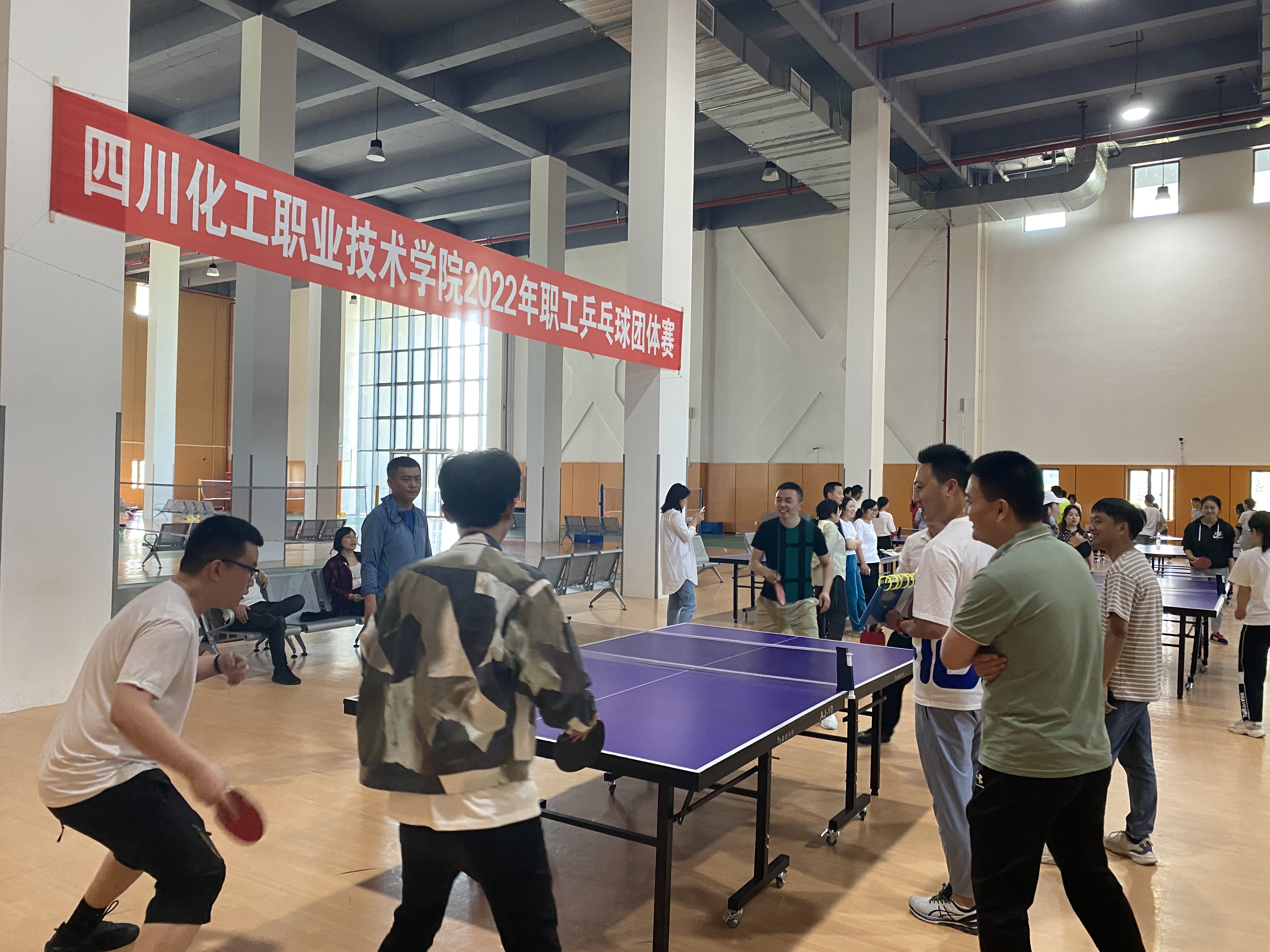乒乓球作为中国的国球,集健身,娱乐,解压等功能于一体,普及率非常高,深受学校的职工喜欢,尽管平日里工作很忙碌,但职工们依然“忙里偷闲”,每天挤出时间投入到球赛中。赛场上,队员们认真,专著,挥汗如雨,奋勇拼搏,将比赛氛围一次又一次推上高潮,白色的小球在蓝台红拍间飞舞,直拍、横拍、扣球、旋转球、弧线球,一个个精彩的防守和绝杀博得现场观众们的阵阵喝彩和掌声,充分展现了我校职工团结奋进,积极向上、勇于争先的体育精神。