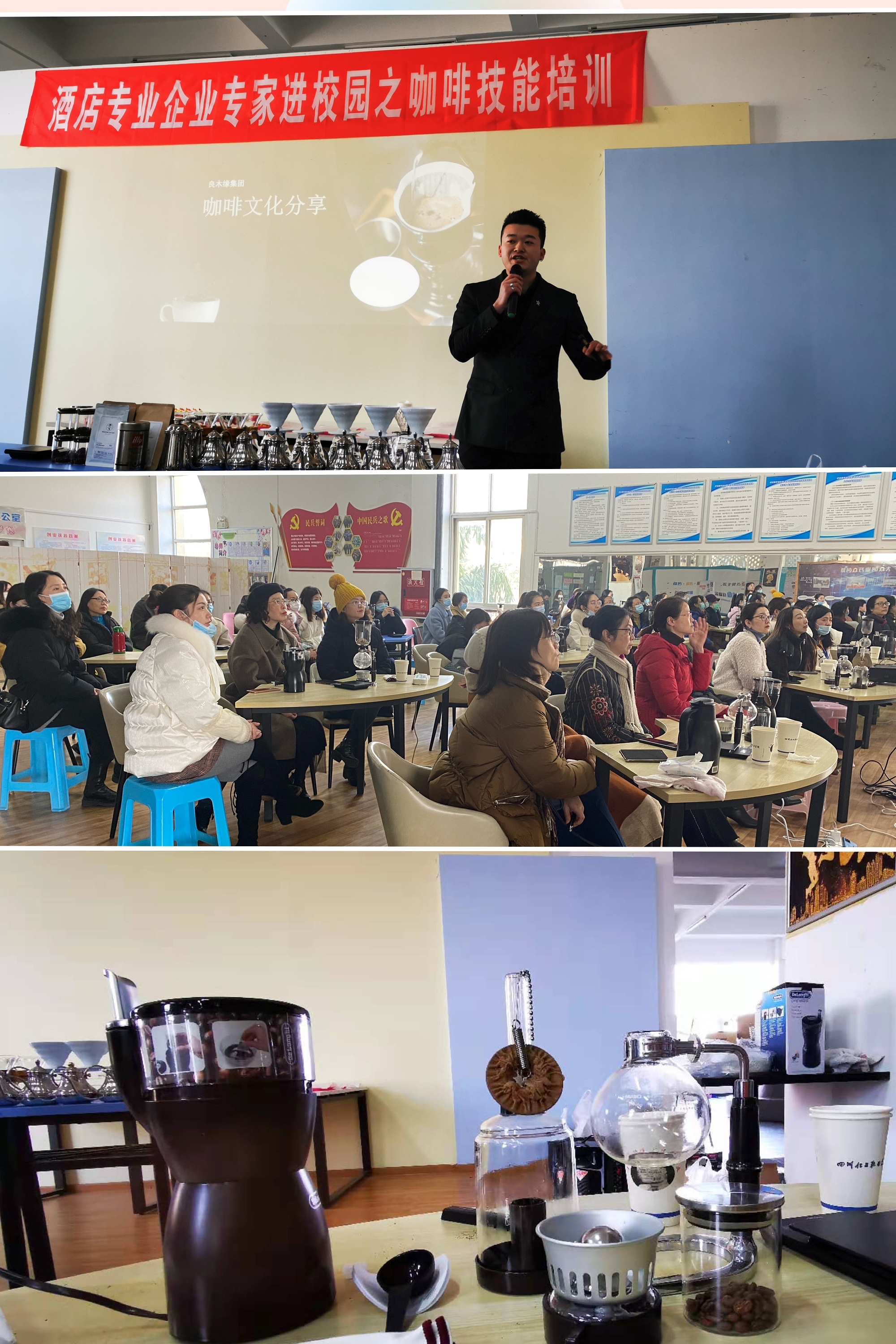此次课程邀请到成都良木缘公司首席咖啡师吴强。吴老师详细讲解了咖啡的起源、历史,咖啡的品种,咖啡豆的制作等知识,并通过视频介绍咖啡的拉花工艺,最后他亲手示范用虹吸法和水冲法制作手磨咖啡。