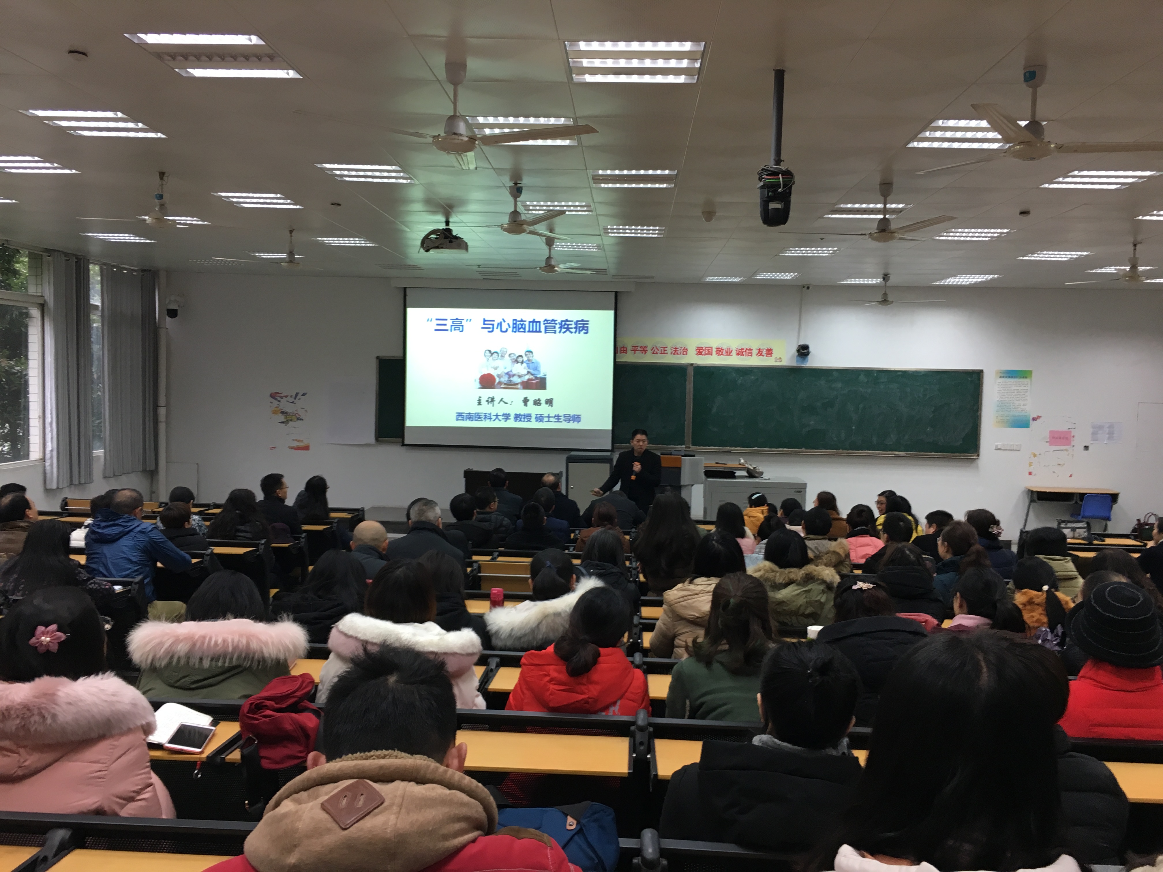 为了进一步提高大家对身体的健康管理水平,让我们及时发现疾病风险并及早控制,增强对健康危险因素的监测、分析、预测、预防的意识。2018年12月14日下午,在学院阶梯教室实A208教室,工会特邀西南医科大学曾昭明、刘杰教授来我院举办题为“家庭健康掌门人”的健康知识讲座。全院共有近百名教职员工现场听了讲座。