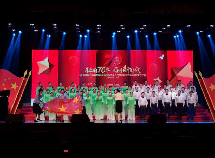 “我爱你中国,我爱你中国,我爱你春天蓬勃的秧苗,我爱你秋日金黄的硕果……”,为庆祝中华人民共和国成立70周年,热情讴歌70年来在党的领导下新中国取得的伟大成就,9月27日下午,四川省经济和信息化厅系统在成都四川电力职业技术学院大礼堂隆重举行庆祝中华人民共和国成立70周年“壮丽70年 奋斗新时代”文艺汇演。我院工会精心组织了60多名教职工,经过一个月的刻苦训练,在学院党委副书记、纪委书记、工会主席陈淑娟的带领下参加了文艺汇演。